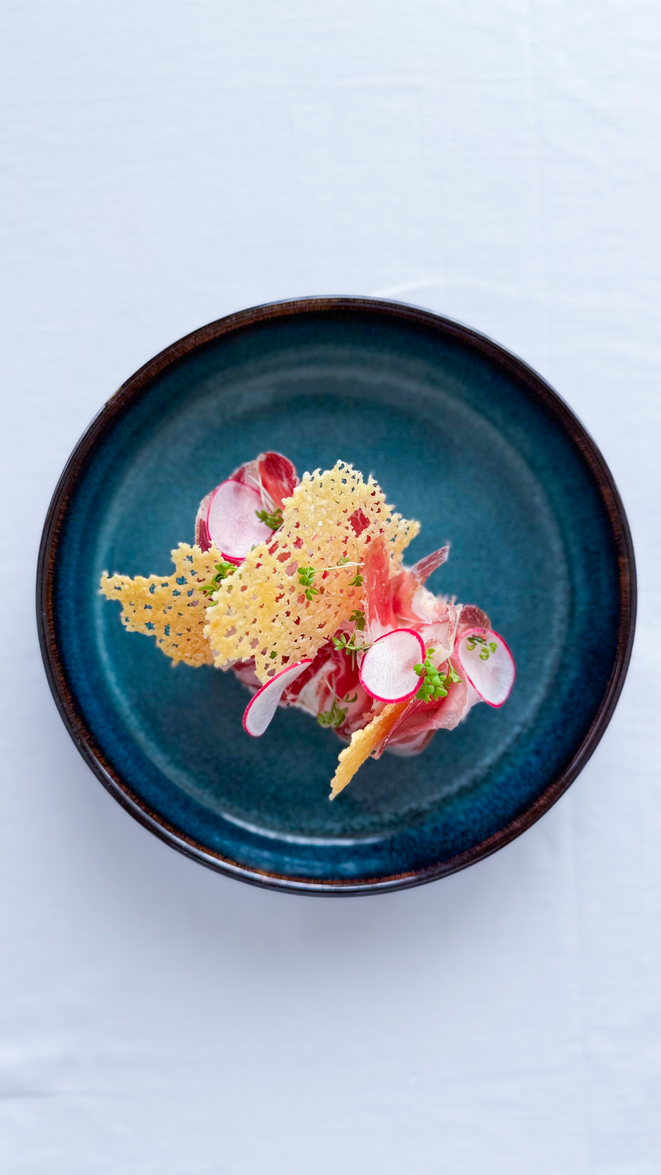 100 g Dried pork neck, horseradish dip, smoked cheese chip, sourdough bread (3,7,8)