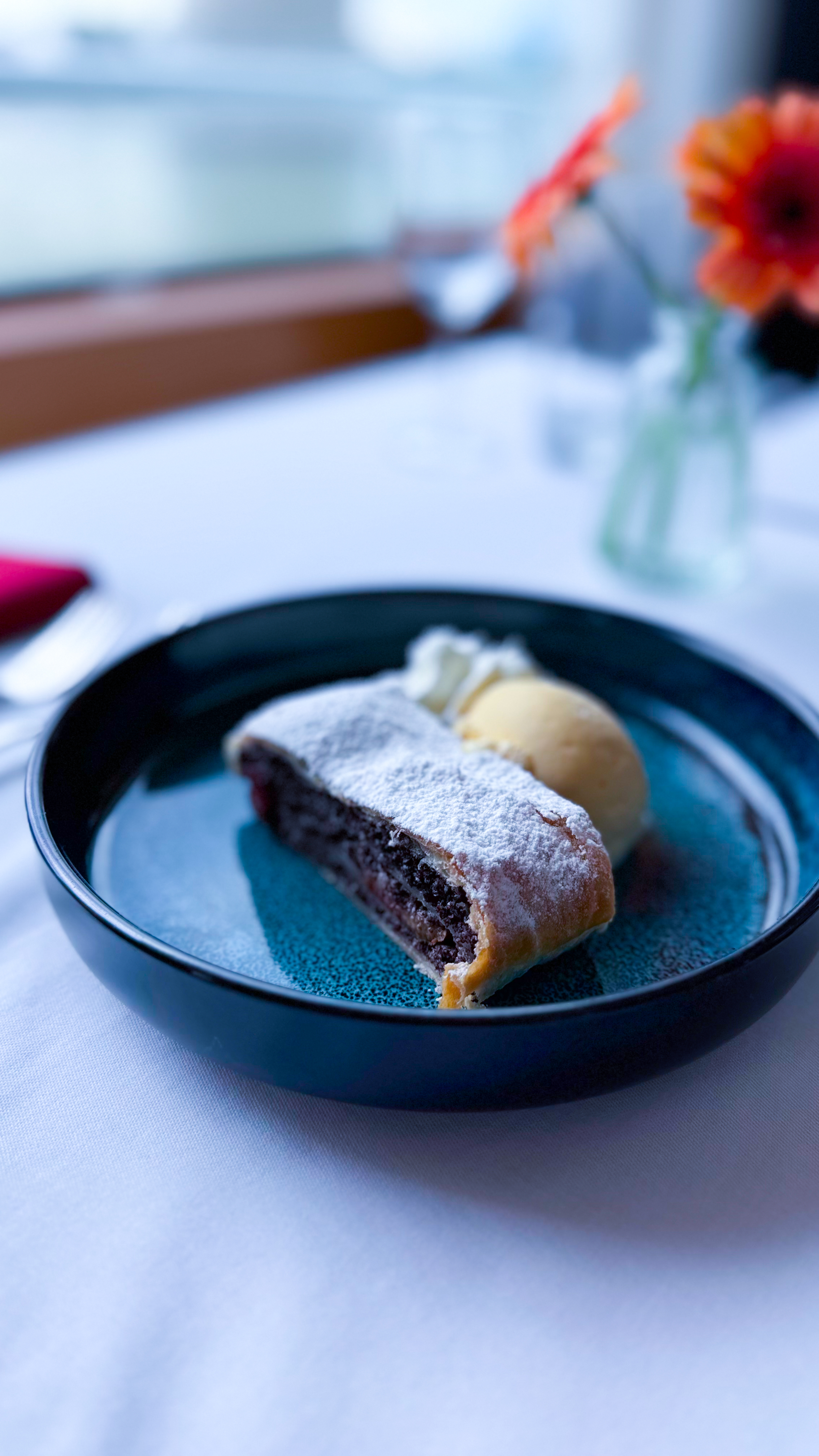 100 g Poppy seed & plum strudel, vanilla ice cream, whipped cream (1,3,7,8)
